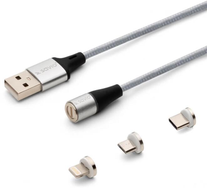 Ezüst színű, 1m hosszú USB - Lightning + Micro USB + USB Type C Átalakító kábel.