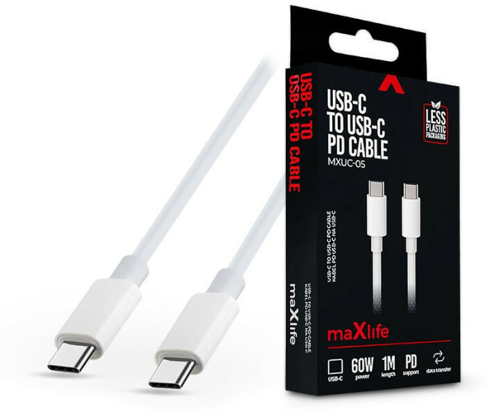 - Maxlife márkájú kábel USB-C- USB-C csatlakozóval. - A gyorstöltési funkcióval értékes időt takaríthat meg. - A kábel kényelmes hossza garantálja az eszközök szabad csatlakoztatását, még a konnektortól távol lévő eszközökhöz is. - A robusztus kivitelezés biztosítja a kábel megfelelő működését. - Teljesítmény: 60 W - A kábel hossza: 1 m