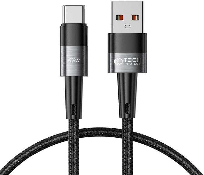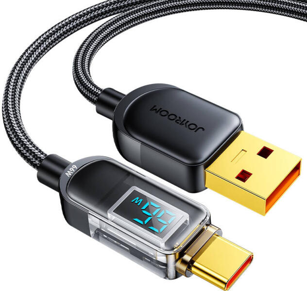 Joyroom S-AC066A4 USB to USB-A Type C 1.2m kábel (fekete). Töltsd fel okostelefonodat egy szempillantás alatt! A Joyroom kábel akár 66W teljesítményű töltést és legfeljebb 480 Mbps adatátviteli sebességet kínál. Biztonságos használatot biztosít, és széles körű kompatibilitással tűnik ki. Emellett egy kis kijelzővel is rendelkezik, amely jelzi a töltési teljesítményt.