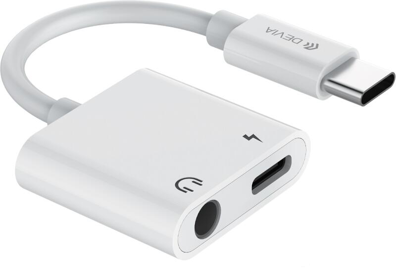 Devia - 2in1 Audio + töltő (Type-C) / Type-C adapter, fehér. A Devia Smart egy adapter ami lehetővé teszi 3,5 mm-es jack csatlakozóval ellátott vezetékes fejhallgató csatlakoztatását, jack aljzattal nem rendelkező okostelefonokhoz. Támogatja a hívásokat és a zenelejátszást. Egy további Type-C port lehetővé teszi az okostelefon töltését a fejhallgató használata közben.