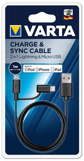 Kábel töltő és szinkronizáló VARTA Lightning és Micro USB csatlakozással Szinkronizáló és töltő kábel 2in1 Micro USB és Lightning csatlakozóval. 1 méter hosszú.