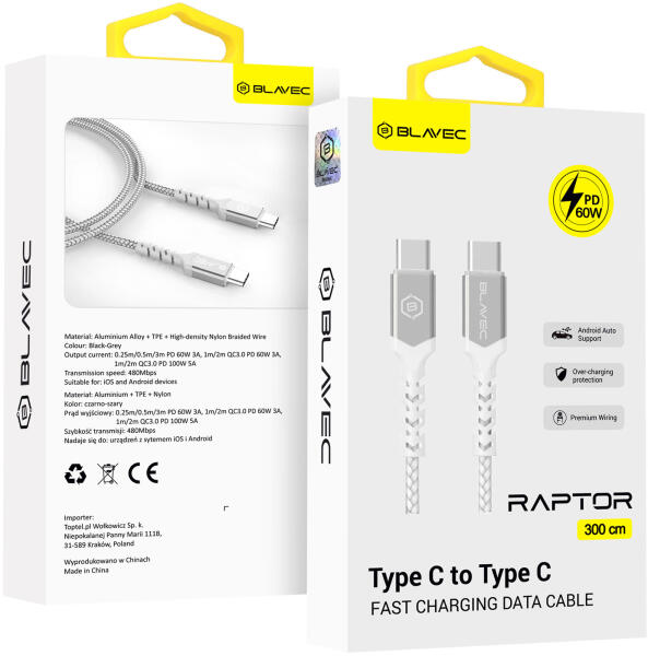 Blavec Raptor Fedezze fel a Blavec Raptor kábel megbízhatóságát és tartósságát. Kábelünk olyan felhasználók számára készült, akik kiváló minőséget és megbízhatóságot keresnek a mindennapi használat során. Nylon fonat Nylon fonattal rendelkezik, amely extra védelmet nyújt a kábel sérülése ellen és megakadályozza a kábel csavarodását. Gumi megerősítés Gumi me