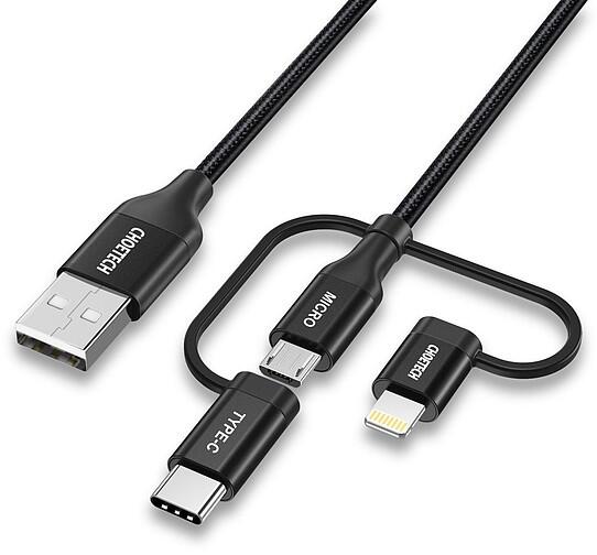 Choetech 3in1 USB MFI Lightning / USB Type C / micro USB kábel (3A töltés / 480Mbps adatátvitel) 1,2m fekete (IP0030-BK) USB kábel 3 csatlakozóval: USB Type C, micro USB és Lightning. Egyetlen kábel, amely lehetővé teszi bármely, ezekkel a csatlakozókkal felszerelt berendezés töltését és adatátvitelt, pl. számítógépről telefonra és számítógépről. Tökéletes azoknak, a