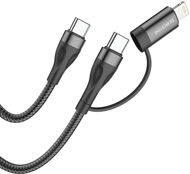 USB Type-C - USB Type-C kábelEgyik végén Lightning átalakítóvalAnyaghasználat: PVCEllenálló nylon szövetes burkolattal ellátvaTöltési áramerősség: 3ATeljesítmény: 20W / 60WSúly: 20gTöbb lépcsős védelemmel ellátvaHossz: 1m