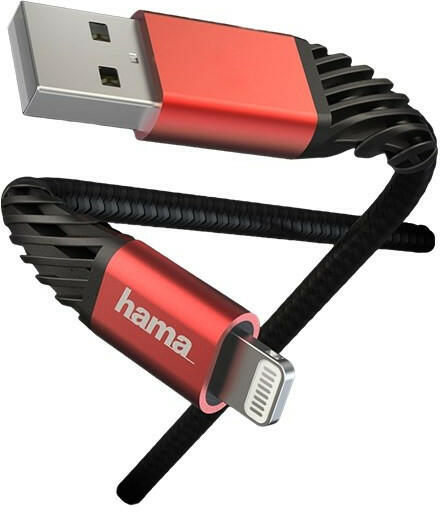 Adatkábel HAMA Extreme Lightning 1,5m fekete/piros A kiváló minőségű húzáscsökkentésnek köszönhetően rendkívül hosszú élettartamú kábel, akár 20 000 hajlítást is kibír Dupla szövetkabát a kiváló minőségű tapintás és a nagyobb tartósság érdekében Elegáns és rugalmas szövetköpeny a további gyűrődés elleni védelem érdekében Elegáns és robusztus alumín
