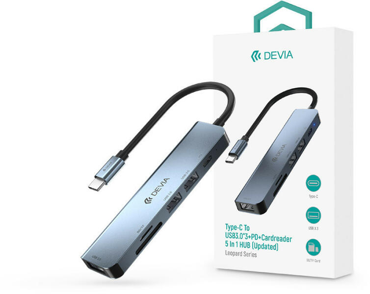 - A DEVIA Leopard 5in1 HUB egy könnyen használható állomás különböző USB-C 3.1 (és újabb) porttal felszerelt eszközökhöz, például MacBook Air, Macbook Pro, Surface Pro, Chromebook Pixel, Huawei Matebook és USB-C 3.1 (és újabb) porttal felszerelt okostelefonokhoz. - A HUB további illesztőprogramok igénybevétele nélkül működik. - Nem kevesebb, mint 5 kimeneti aljzattal ren