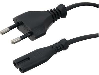 Euro hálózati kábel, 1,8 m sw II. érintésvédelmi osztályú, EN 50075 ráöntött PVC euro dugóval, törésgátlóval, kettős szigeteléssel és 2 pólusú, II. érintésvédelmi osztályú, EN 60320-1/C7 PVC kiskészülék dugaljjal (D2 típus), törésgátlóval. Műszaki adatok: Csatlakozó típus A (illetve bemenetek): Euro dugó · Csatlakozó típus B (illetve kimenetek): Kiskészül