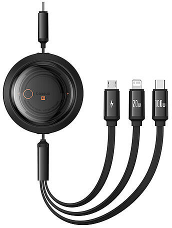 Baseus Free2Draw CB000084 visszahúzható USB-C - Lightning / USB-C / micro USB kábel 100 W 1,1 m - fekete