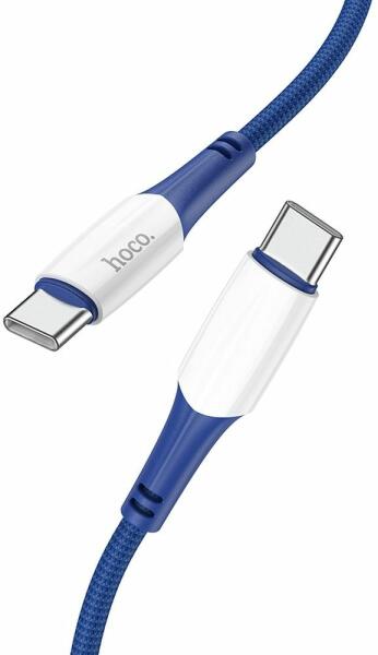 HOCO X70 - Type-C / Type-C (USB-C) kék/fehér szövet gyorstöltő kábel, 1m hosszú és 3A maximális áramerősséggel. Ez a kábel támogatja a gyorstöltési funkciót 60 W-ig, beleértve a Power Delivery-t, a Quick Charge-t és más protokollokat, hogy lerövidítse az eszközök töltési idejét (gyorstöltési funkcióval rendelkező töltőfej szükséges), és lehetővé teszi az adat