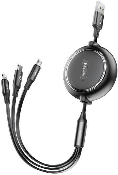 Baseus Golden Loop 3in1 USB kábel - micro USB / Lightning / USB-C 3.5A 35cm - 120cm: USB visszahúzható töltőkábel 3 különböző csatlakozóval: USB-C / micro USB / Lightning Egy mindenhez - Tökéletes kiegészítő minden USB-C, micro USB és Lightning porttal rendelkező készülékhez . Töltsön 3 eszközt egyszerre! - A Baseus Rapid egyszerre akár 3 mobileszköz energiáját is képe