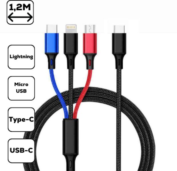Multifunkciós töltőkábel, 1 Type-C, 1 Lightning iPhone csatlakozó, 1 Micro USB, 1 USB C - 1,2m Ideális okostelefonok, tabletek és egyéb elektronikus eszközök töltéséhez otthon, munkában vagy utazáskor. ( Adatátvitelre nem alkalmas. )