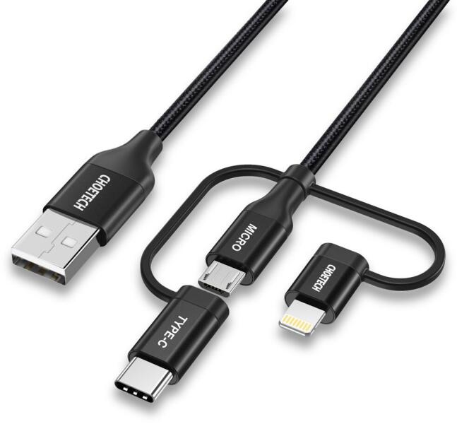 Choetech 3in1 MFI kábel USB - USB Type C / micro USB / Lightning (charging 3A / data transmission 480 Mbps) 1.2m fekete (IP0030-BK)