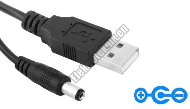 USB 2.0 dugó-DC 5,5/2,1/11mm Dugóval szerelt kábel. Jellemzők: - Hossz: 1m - USB 2.0 dugó - DC 5,5/2,1/11mm dugó - Fordított polaritású DC dugó 5.5mm pozitív / 2.1mm negatív - Szín: fekete - Bliszteres csomagolás