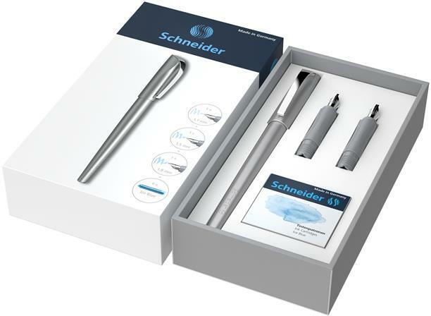 A Schneider Callissima töltőtolla a lapos és egyenes tollhegynek köszönhetően tökéletes a kalligrafikus íráshoz. - a készlet tartalma: egy töltőtoll 1,1 mm-es tollheggyel, egy 1,5 mm-es és egy 1,8-mm-es tollhegy - elegáns, metálfényű külsővel rendelkezik - erős fémklip - kék színű tinta - a vékony tolltest és az ergonomikus kialakítású fogórész lehetővé teszi a k