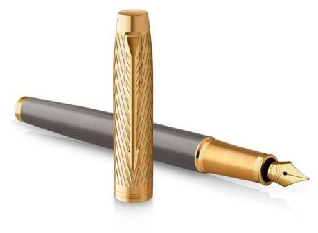 A Parker IM Premium Pioneers Collection Arrow GT töltőtoll rozsdamentes acél testtel rendelkezik, amelyet fényes szürke lakk borít. a töltőtoll rozsdamentes acél hegye dekoratív gravírozással és PVD technikával aranyozott fedél a kémiai maratással létrehozott ikonikus "nyíl" mintával a tintapatronok használatának és a konverterből történő feltöltésének lehetősége (n