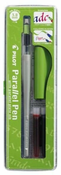 Töltőtoll, 0,5-3,8 mm, zöld kupak, PILOT Parallel Pen (PPP38Z) - PILOT Parallel Pen kalligrafikus töltőtoll - vonalvastagság: 0,5-3,8 mm - rozsdamentes acélheggyel, tintaszabályozó rendszerrel - látható tintaszint - tisztítóegységgel és két darab tintapatronnal szállítva (1 db fekete és 1 db piros) - kompatibilis patronok: PICPS6L, PICPAST