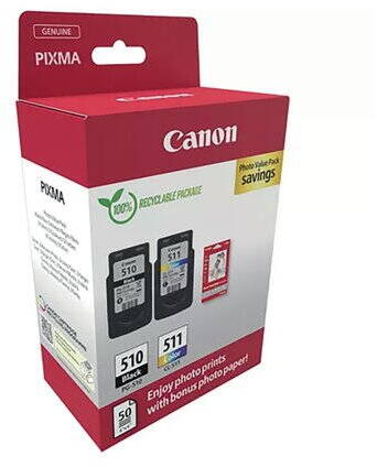 Canon PG-510 (1x9ml) + CL-511 (1x9ml) + 50 lap GP501 10x15 fényes fotópapír Multipack Canon PG-510 (1x9 ml) + CL-511 (1x9 ml) + GP-501 fotópapír Multipack – Eredeti A Canon PG-510 + CL-511 Multipack (2970B017) praktikus csomag, amely egy fekete tintapatront (9 ml), egy színes tintapatront (9 ml) és 50 lap 10x15 cm-es GP-501 prémium fényes fotópapírt tartalmaz. Tökéletes választás,