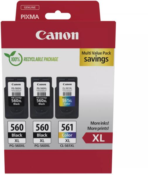 Canon PG-560XLx2 + CL-561XL Multipack 2x14,3 ml +1x12,2 ml Canon PG-560XLx2 + CL-561XL Tintapatron Multipack – Eredeti A Canon PG-560XLx2 + CL-561XL Multipack (Cikkszám: 3712C009) gazdaságos csomag két fekete XL kapacitású tintapatront (14,3 ml x 2) és egy színes XL tintapatront (12,2 ml) tartalmaz. Ez az eredeti Canon csomag tűéles fekete szövegeket és színgazdag nyomatokat biztosí