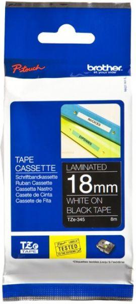 A Brother TZe-345 szalag egy 18 mm széles szalag, amely fehér színű feliratot biztosít fekete háttéren, így kifejezetten kontrasztos és jól látható címkéket lehet vele készíteni. A hőnyomtatásos technológiának köszönhetően nincs szükség tintára vagy festékre, a szalag pedig rendkívül tartós: víz-, karc-, olaj- és UV-álló, így akár extrém környezetben is hossz