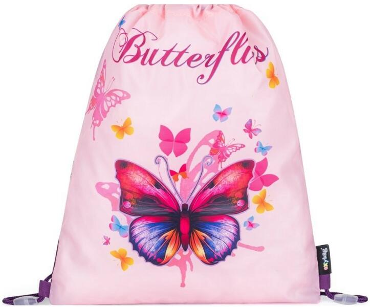 Cipőzsák pillangós motívummal. A húrok meghúzásával zárható, hátul viselhető, vagy iskolai hátizsákhoz rögzíthető. Anyaga 100% poliészter. Méretek: 37 x 30 cm Súly: 50 g