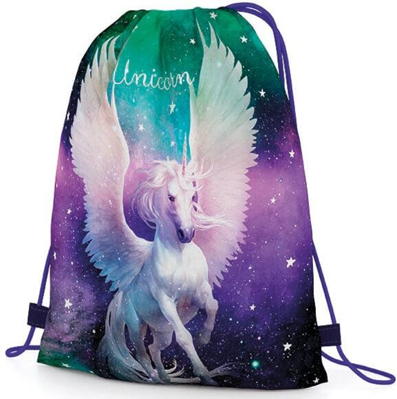 Papucs táska egyszarvú motívummal. Zárja be a zsinórok húzásával, hogy viselje a hátát, vagy rögzítse az iskolatáskához. Anyaga 100% poliészter.