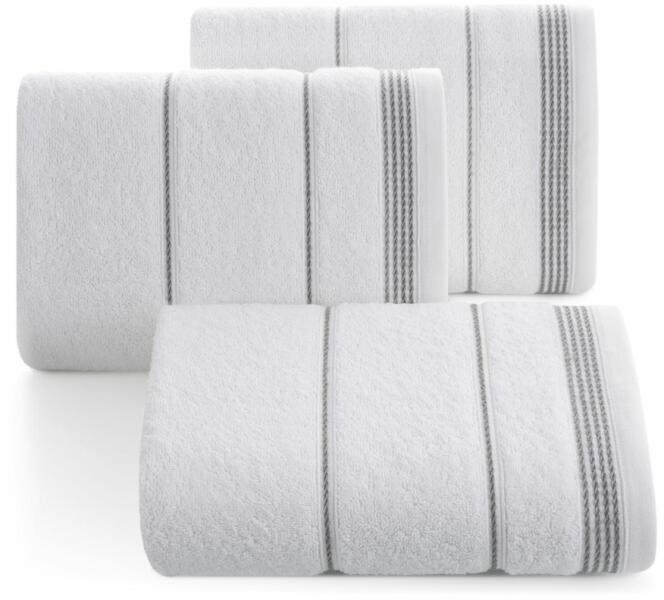 Puha, klasszikus fürdő törölköző nedvszívó pamut frottír díszített finom, elegáns bordure. Egyszínű törölköző nem hagy foltot. Szélesség: 70 cm, hossz 140 cm, a színe fehér / ezüst. Súly: 500 GSM. Összetétel: 100% pamut, 60% pamut 40% poliészter