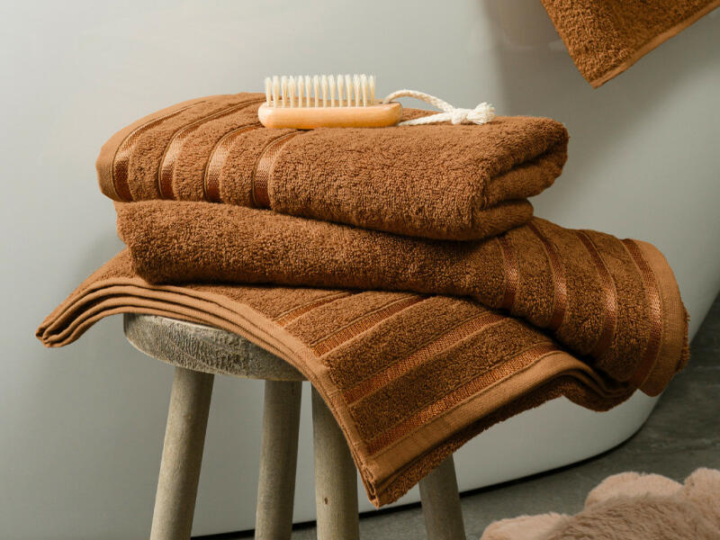 100 % hosszúszálú fésült pamut - frottír kezelésű, erősen nedvszívó, kellemes tapintású, felvarrt bordűr csíkok, magas minőség, súly 510g/m2.