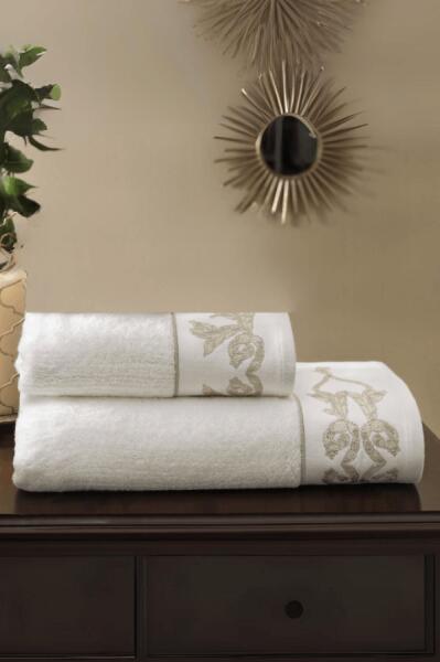 DURANTE törölköző és fürdőlepedő szett, 2 db (50x100 cm + 75x150 cm) Szerelem az első tapintásra -- ilyen a 100%-os pamutból gyártott, puha, nedvszívó és kényelmes DURANTE törölköző és fürdőlepedő szett. A kinézetében sem csalódik a vajszínű elegáns díszítés jól illik mindegyik fürdőszobába.