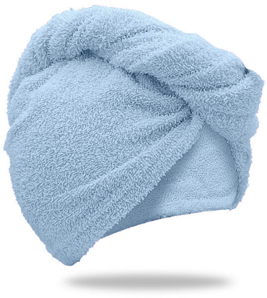 A gyorsan száradó frottír turbán kiváló eszköz a nedves haj ápolására. Ideális mindennapi használatra otthoni hajmosás közben, úszómedencéknél, strandokon vagy fodrászatokban is használható. A frottír szövet kiváló nedvszívó képességével rendelkezik, miközben megőrzi puhaságát. A világoskék frottír turbán tökéletes ápolást biztosít a frissen mosott hajnak