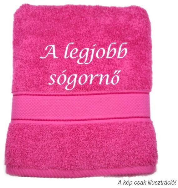 Hímzett, A legjobb sógornő feliratos törölköző . Tökéletes ajándék sógornőjének. A törölköző színét a legördülő listából tudja kiválasztani. A megadott ár 1 db hímzett törölközőre vonatkozik. A hímzett törölköző mérete kb. 70x140 cm (+/- 5%). Anyaga 100% pamut (380 g/nm +/- 5%). A hímzés magassága kb. 5-7 cm. FONTOS! A fénykép illusztráció. A törölkö