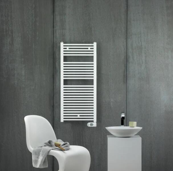 Zehnder Aura elektromos törölközőszárító radiátor, egyenes, fehér 900x500 mm Raktárkészletről azonnal elvihető! A radiátor gyárilag készre van szerelve ezért akár házilag is felszerelhető. Nem kell a fűtésrendszerre kötni. Csak a fali tartókat kell felfúrni és bedugni a konnektorba. Kizárólag elektromosan működik. A formatervezett Zehnder Aura radiátorokat vízszinte