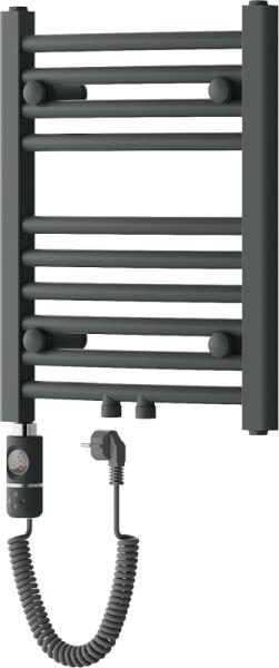 Műszaki adatok: Magasság: 500 mm Szélesség: 400 mm Mélység: 44 mm Szín: antracit Anyaga: acél Fűtőteljesítmény: 300 W Fűtőrudak száma: 10 db Długość całkowita grzałki: 426 mm Fűtőelem hossza: 310 mm Tápkábel hossza: 1,5 m Üzemi feszültség: 230V/50 Hz Védettség: IP44 Sterowanie dotikowe za wysządka LED kijelző Dodatkove zabezpieczenie przed pracą on "dry" A beépíte