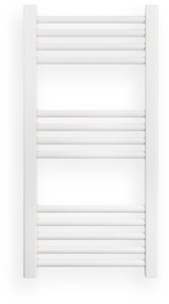 Törölközőszárító radiátor 40 x 80 cm-es méretben, fehér színben. Egyenes kivitel 3 szekcióra oszott csövekkel (4-4-4). A radiátor tartozéka a 3 db rögzítő konzol és a menetes dugók. A Nero Italia fürdőszobai radiátorok kimagasló gyártási minőségben előállított termékek, első osztályú acél felhasználásával készült, precizíós, nagy tartósságú és egyenle