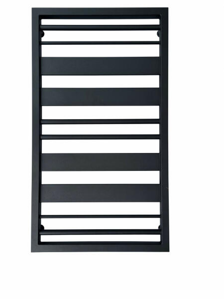 Weberg Baltic törölközőszárító design radiátor 94x53 cm-es méretben, fekete színben. Magas minőségű design radiátor, a vékony és vastag vízszintes idomok váltakozása mozgalmas, egyedi megjelenést ad. A radiátor tartozéka a 4 db rögzítő konzol és a menetes dugók. 50 cm széles alsó víz bekötési kiállással. G 1/2" belső menet. Szintén rendelhető elektromos fűtőp