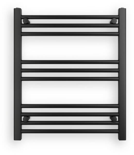 Ecoradco törölközőszárító radiátor 60 x 70 cm-es méretben, fekete színben. Egyenes kivitel 3 szekcióra bontott csövekkel (3+3+4 arányban). A radiátor tartozéka a 3 db rögzítő konzol és a menetes dugók. Működtethető elektromos fűtőbetéttel is. Paraméterek: Magasság: 70 cm Teljes szélesség: 60 cm Kötéstávolság: 55.5 cm Teljesítmény: 353 W Kcal: 322 Bekötés: als