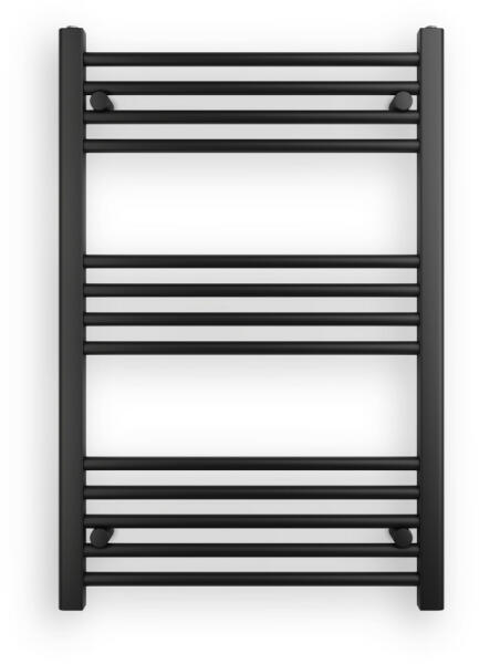 Ecoradco törölközőszárító radiátor 60 x 90 cm-es méretben, fekete színben. Egyenes kivitel 3 szekcióra bontott csövekkel (4+4+5 arányban). A radiátor tartozéka a 3 db rögzítő konzol és a menetes dugók. Működtethető elektromos fűtőbetéttel is. Paraméterek: Magasság: 90 cm Teljes szélesség: 60 cm Kötéstávolság: 55.5 cm Teljesítmény: 426 W Kcal: 385 Bekötés: als