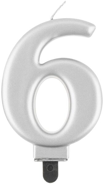 Torta gyertya. 6-os szám. Metál ezüst színben, 8 cm magas.