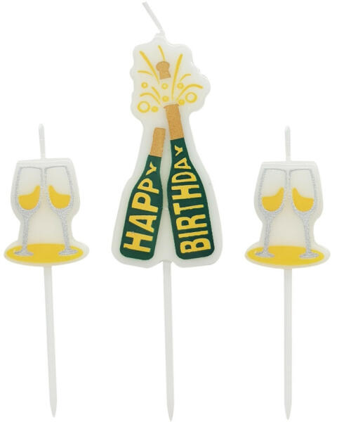 Happy Birthday feliratú pezsgő formájú születésnapi gyertya , melynek segítségével igazán egyedi színt varázsolhatsz az ünnepi tortára vagy süteményre. Tulajdonságok: Anyaga: paraffin és műanyag A gyertyák mérete: - Pezsgős üveg: 35 mm × 120 mm (a beszúró résszel együtt) - Pezsgős pohár: 25 mm × 80 mm (a beszúró résszel együtt)
