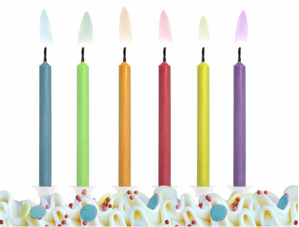 Torta gyertya. 6db / csomag. A gyertya lángja olyan színnel ég amilyen színű a gyertya.