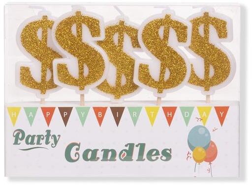 Egyedi tortagyertyával szeretnéd meglepni az ünnepeltet?Ezzel a helyes 5 db arany csillogós dollár jeles tortagyertyával garantáltan megcsillogtatod az ünnepelt szemeit. Ez a mutatós figurás gyertya tökéletesen illik tortákra, apró süteményekre és muffinokra is. A figurák mérete: 5 cm