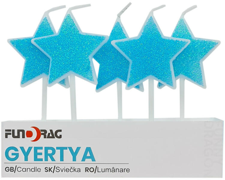5 darabos, kék csillagokat mintázó gyertya szett , mely segítségével minden kisgyerek tortájára egy különleges világot varázsolhatunk. Tulajdonságok: Anyaga: viasz és műanyag pálcika A gyertyák magassága a pálcikával együtt: 7,5 cm A csomagban 5 gyertya található.