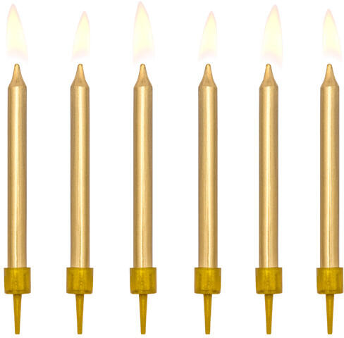 Születésnapi gyertyák sima, metál arany, mérete kb. 6 cm, a készlet 6 db gyertyát és 6 db tartót tartalmaz. (1 db / 6 db. )