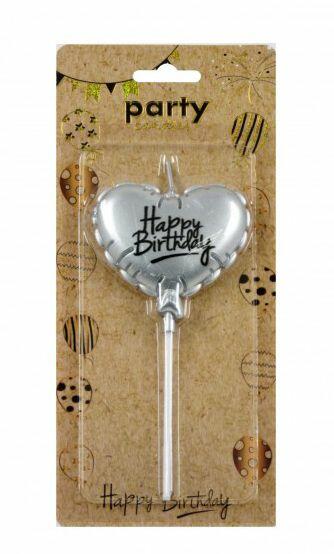 Tortagyertya Happy Birthday ezüst szív 13,5cm 625342 Befoglaló méretek 9x1.5x20 cmAnyaga paraffin