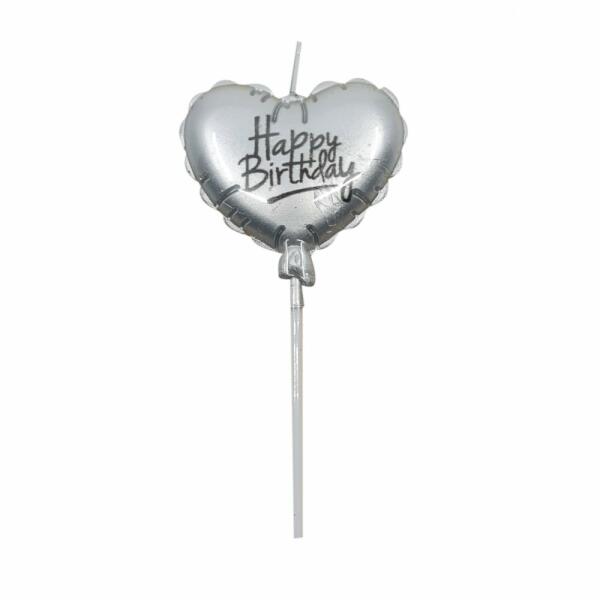Ezüst színű, Happy Birthday feliratú, lufi formájú és szív alakú tortagyertya , mely igazi dísze lehet minden szülinapos tortának. Tulajdonságok: Anyaga: viasz és műanyag A gyertya mérete: - Magassága: 140 mm - Szív mérete: 50 mm × 60 mm Színe: ezüst