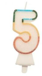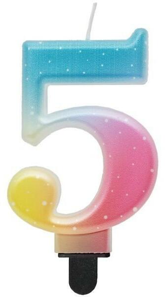 Ezzel a szivárvány színű pasztell árnyalatú 5-ös számgyertyával igazán ünnepivé varázsolható bármelyik születésnapi torta. A beszúró tüskének köszönhetően a gyertya egyszerűen és stabilan beleállítható a tortába. Jó választás kicsiknek és nagyoknak egyaránt. Tökéletes tortadísz évfordulókra, céges rendezvényekre és természetesen születésnapokra. A gyer