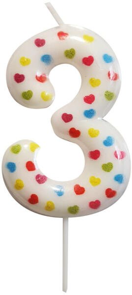 Fehér színű, szívecske mintás számgyertya , mellyel egyszerűen díszítheted az otthon készített vagy boltban vett születésnapi tortát. Tulajdonságok: Anyaga: viasz A gyertya mérete: - Magassága: 90 mm - Szélessége: 40 mm