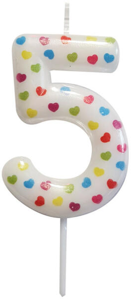 Fehér színű, szívecske mintás számgyertya , mellyel egyszerűen díszítheted az otthon készített vagy boltban vett születésnapi tortát. Tulajdonságok: Anyaga: viasz A gyertya mérete: - Magassága: 90 mm - Szélessége: 40 mm