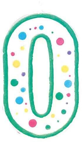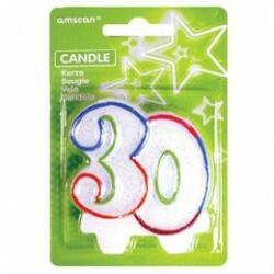 Fehér gyertya színes kerettel és ezüst csillámmal szülinapra. Mérete: 8 cm. Anyaga: paraffin.