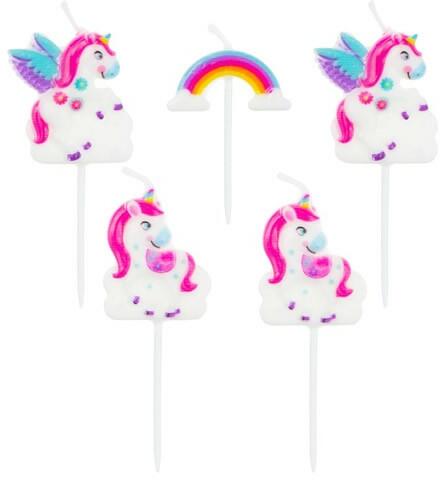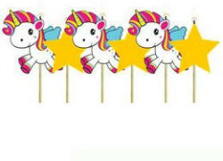 Aranyos 3 db egyszarvús gyertya, és sárga csillag alakú gyertya, hogy a szülinapi torta még szebb legyen.