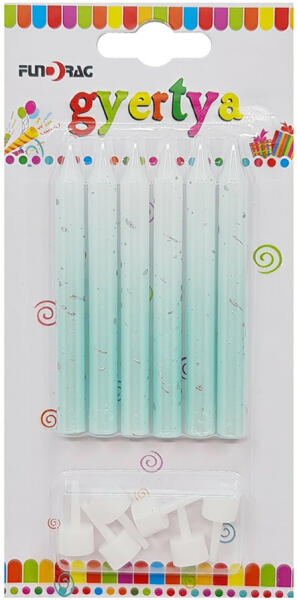 6 darabos pasztell kék színű születésnapi gyertya , mely segítségével minden születésnapos tortájára egy különleges világot varázsolhatunk. Tulajdonságok: Anyaga: viasz és műanyag A gyertyák magassága a műanyag tartóval együtt: 9 cm A csomagban 6 darab gyertya található, fehér színű gyertyatartókkal.